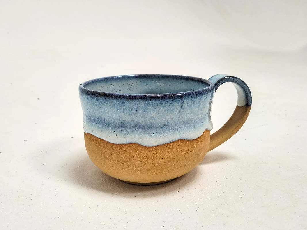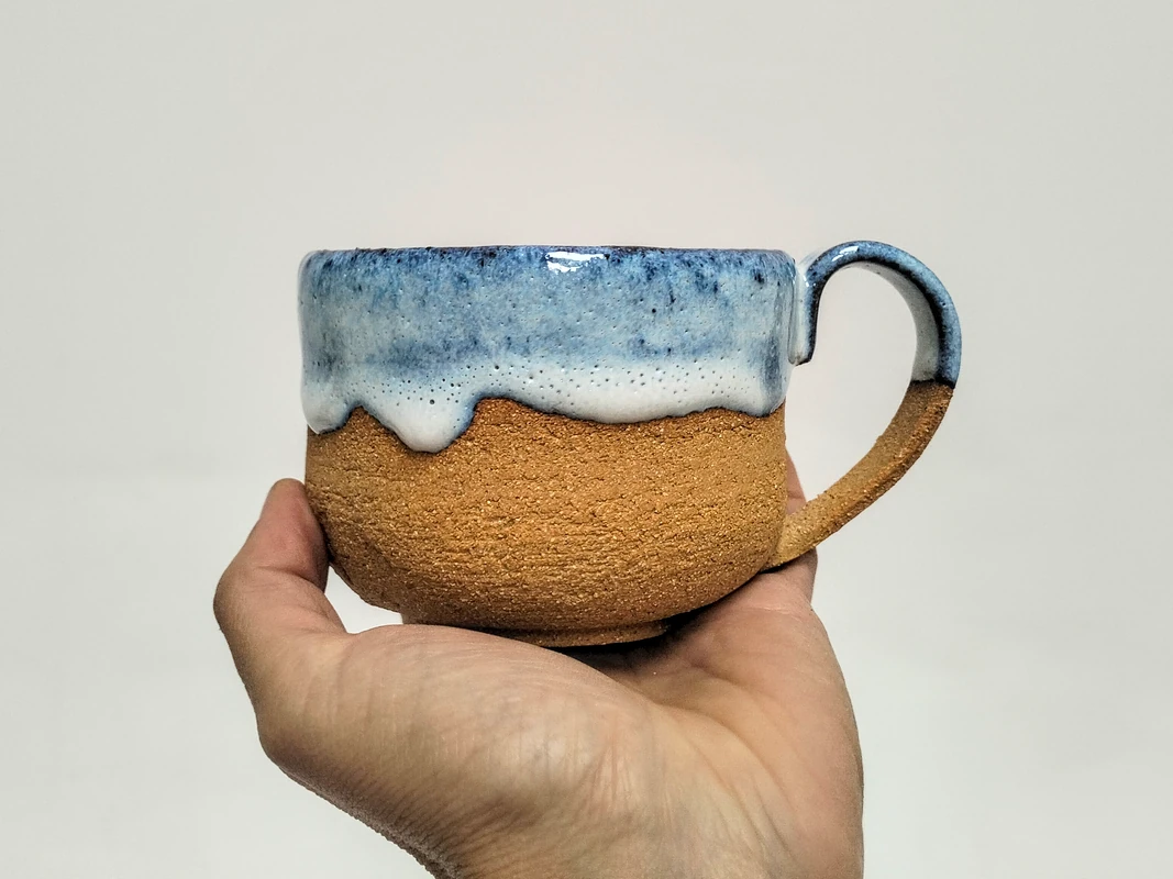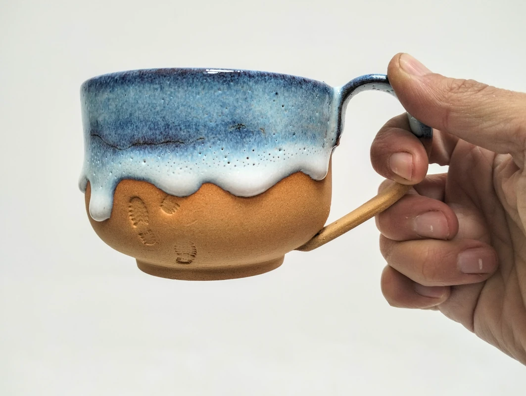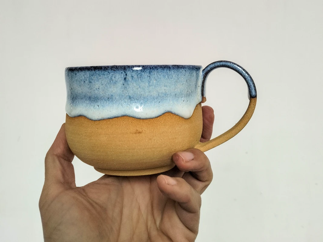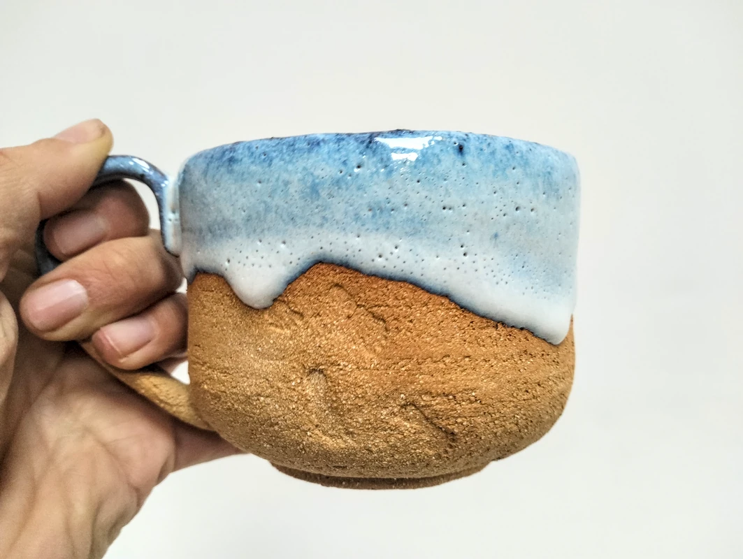 Grande tasse en grès roux et émail bleu.