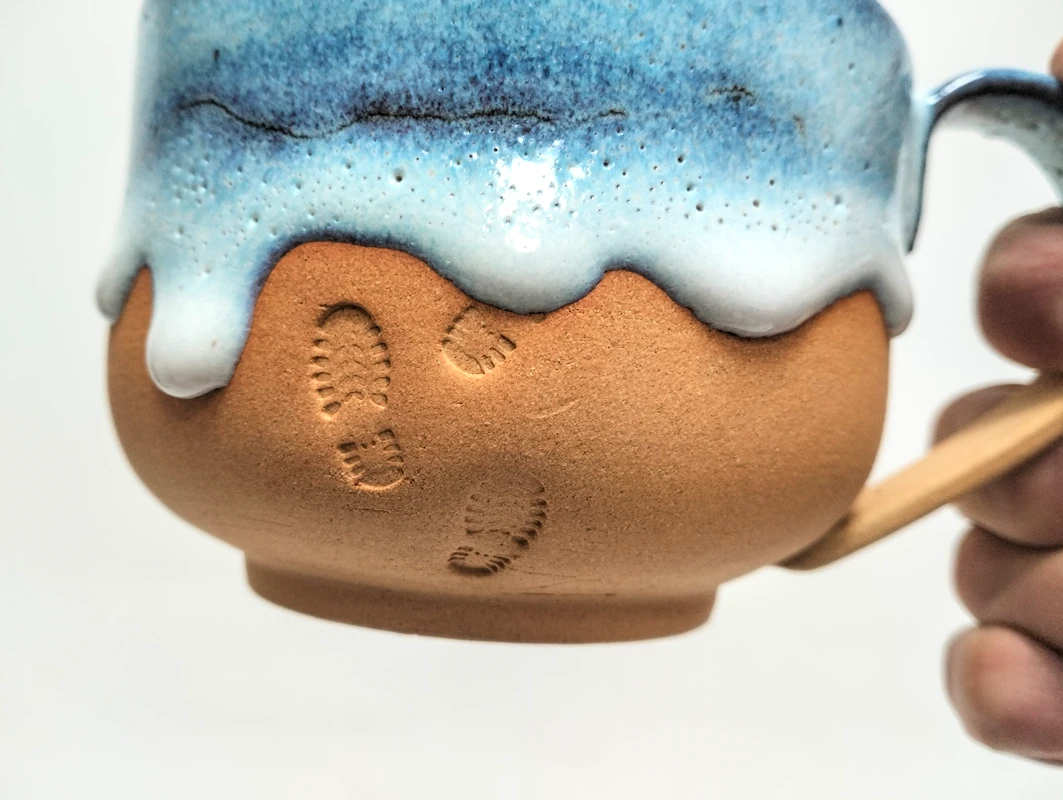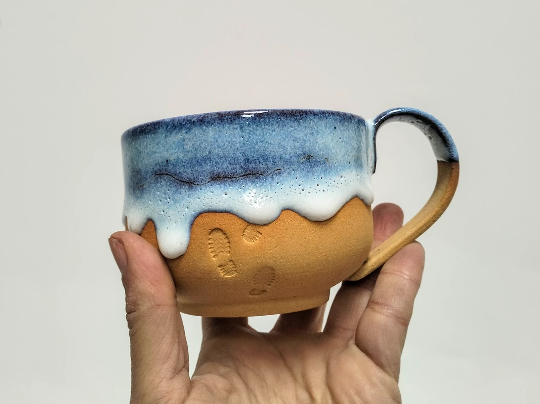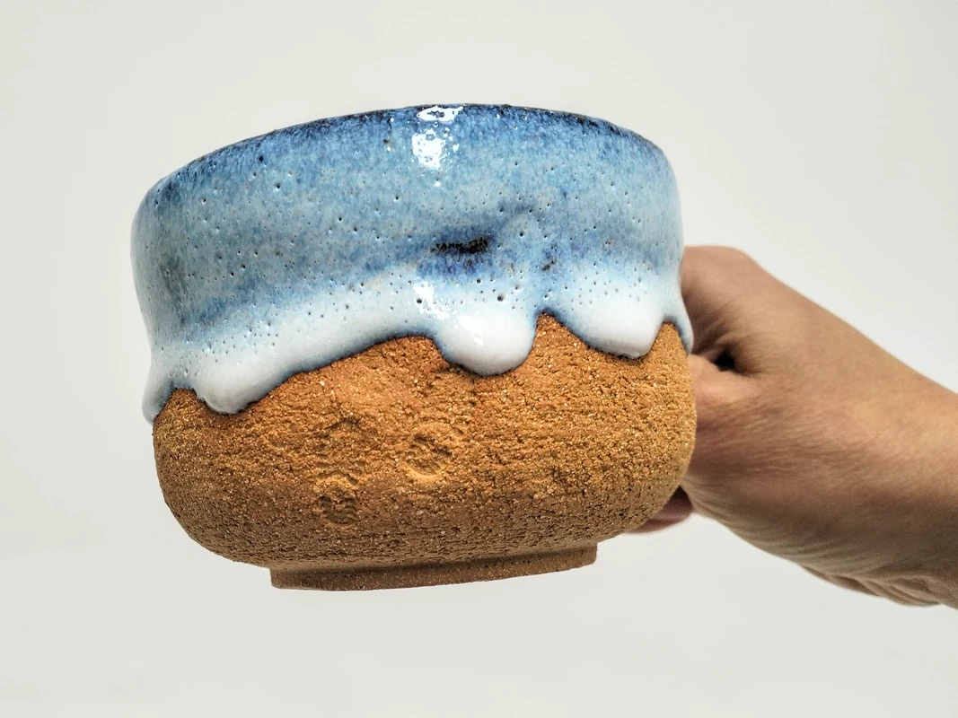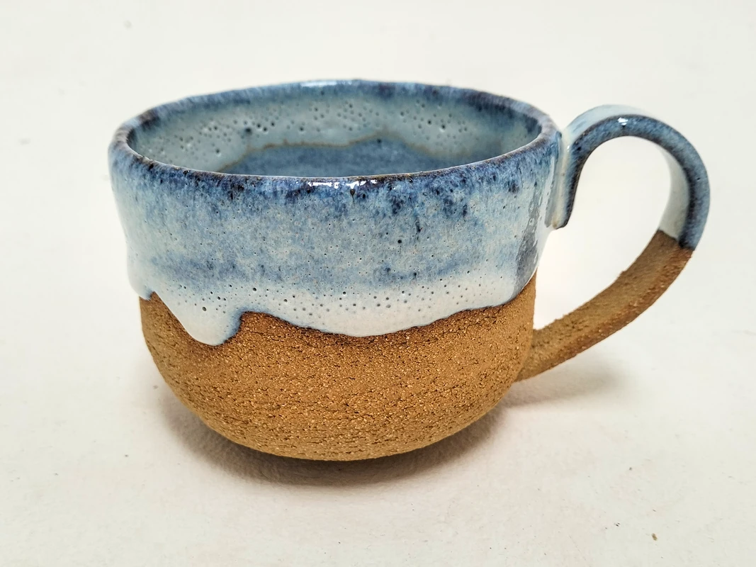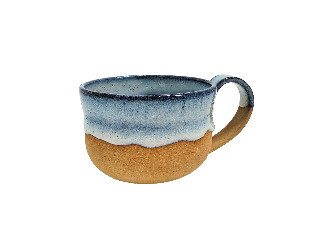 Grande tasse en grès roux et émail bleu.